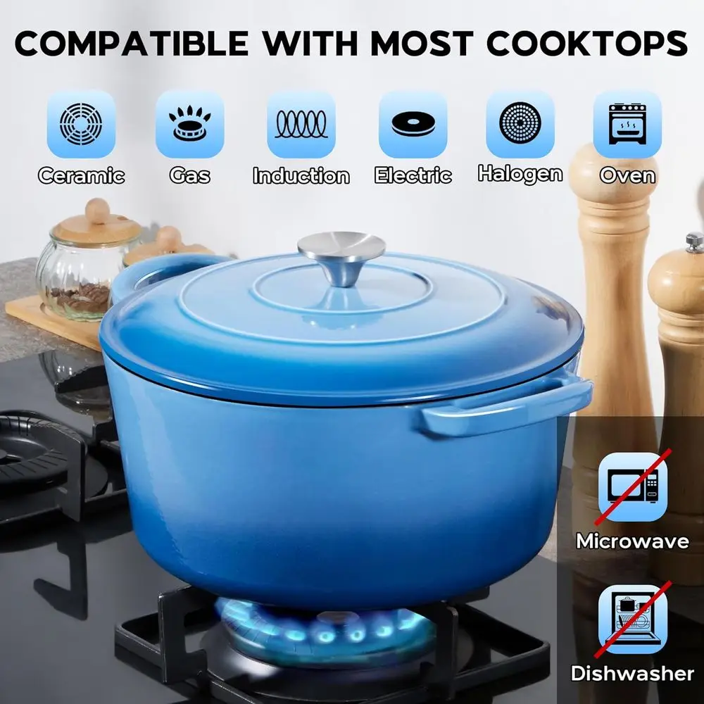 Cook and bake with ease using this 7-quart blue enameled cast iron Dutch oven.