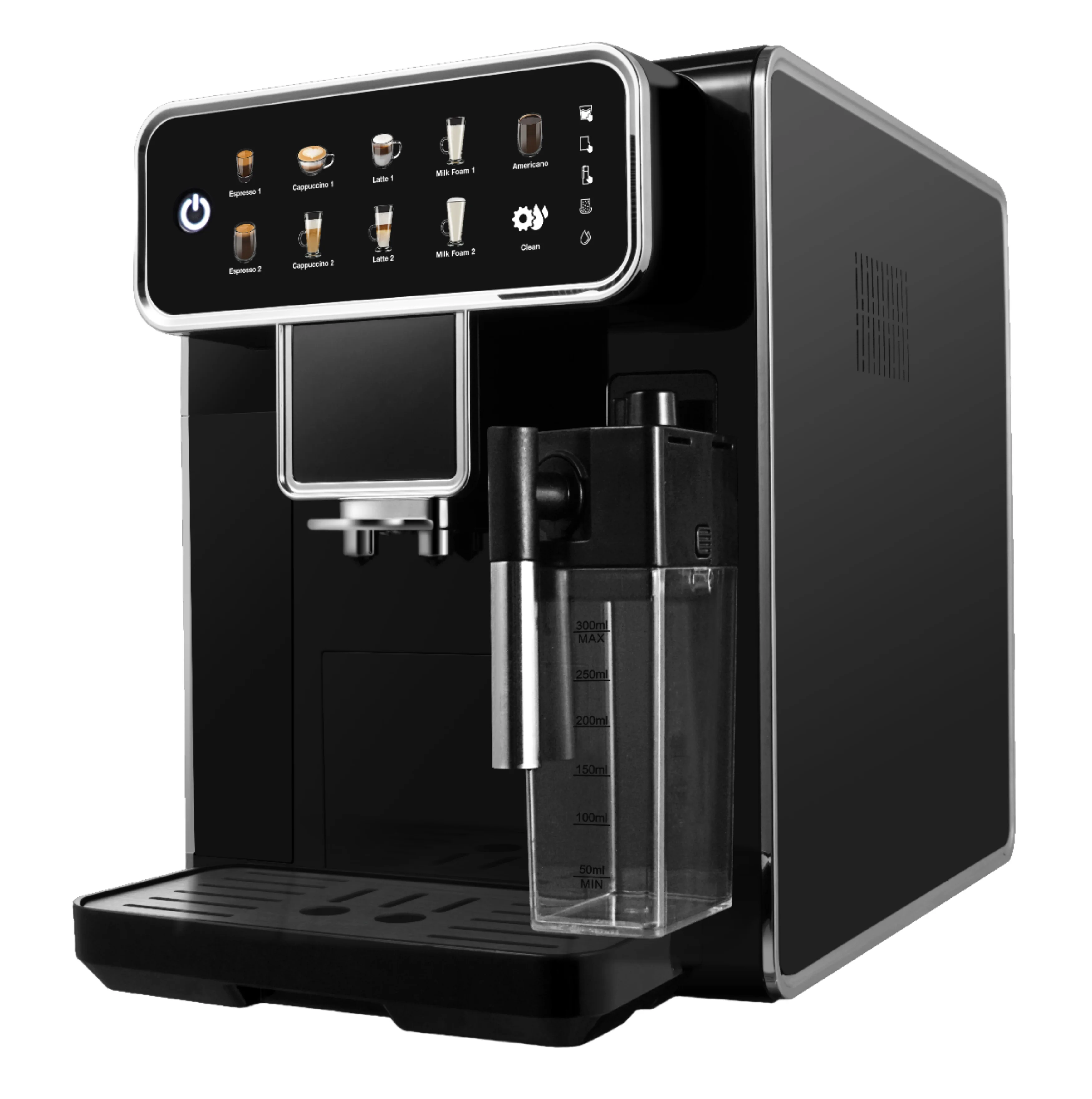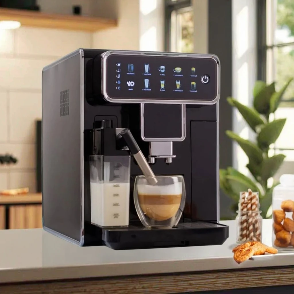 This fully automatic bean-to-cup espresso machine is designed for convenient home coffee brewing.