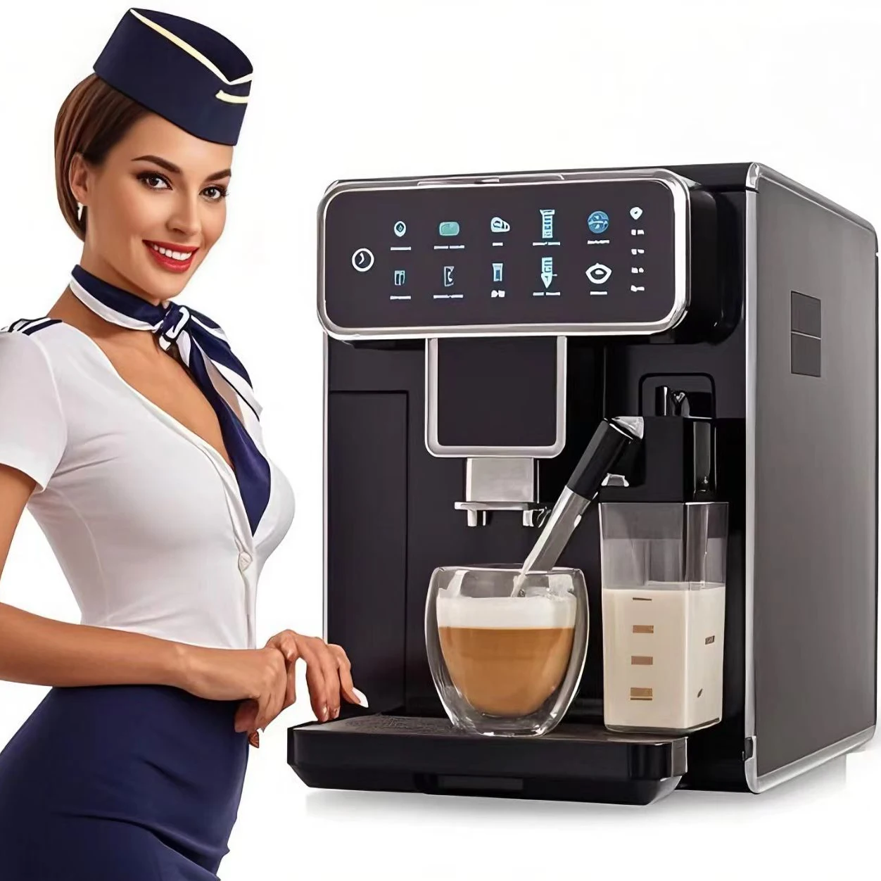 It includes a milk container for easy preparation of creamy milk-based beverages.