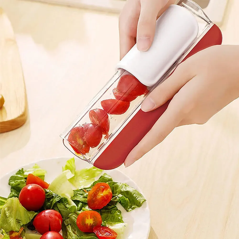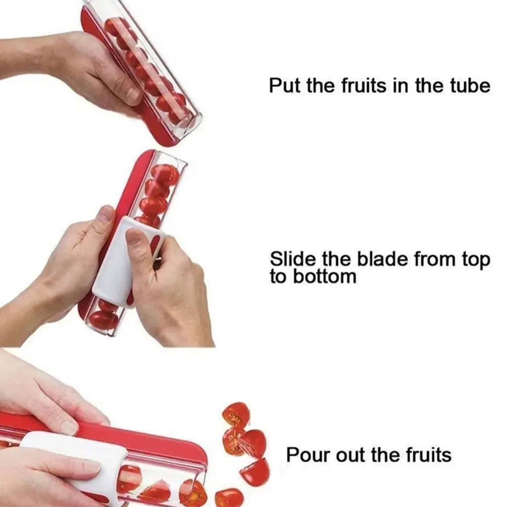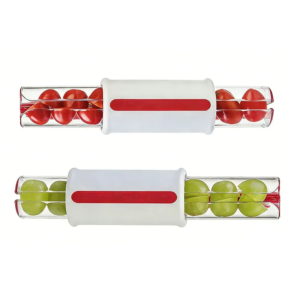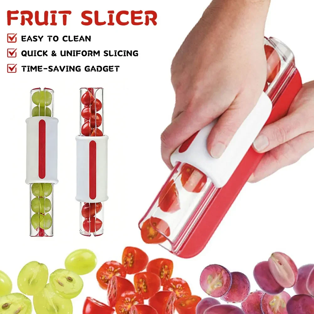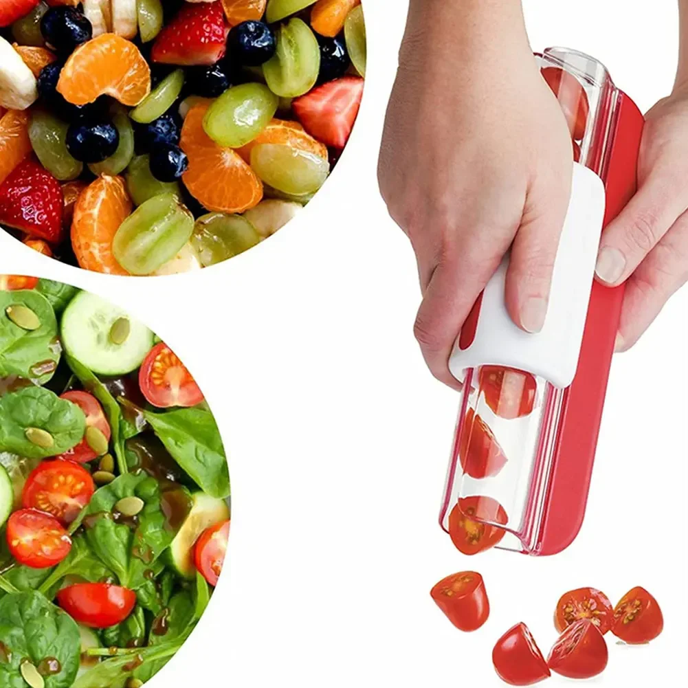 It is designed to slice grapes, tomatoes, and other small fruits effortlessly.