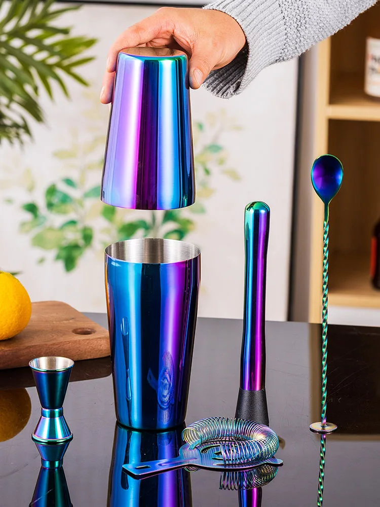 This 5-piece rainbow cocktail shaker bar set is designed for making professional-quality drinks at home or in a bar.