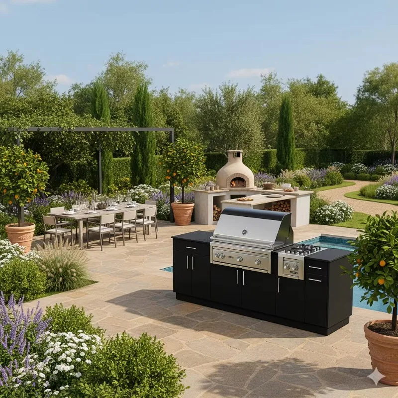 Upgrade your outdoor living space with this Custom Stainless Steel BBQ Kitchen built for performance and style. Designed with a sturdy structure, it provides a reliable setup for all your outdoor cooking needs. The integrated gas grill delivers powerful heat for perfectly cooked meals every time. A built-in sink adds convenience for food prep and easy cleanup. Equipped with a fridge, it keeps your ingredients and beverages fresh and within reach. Ideal for patios, gardens, and backyard entertaining areas. The stainless steel construction ensures durability and resistance to outdoor conditions. Its sleek and modern design enhances the look of any outdoor space. Perfect for hosting BBQs, gatherings, and family meals. Create a complete outdoor cooking experience with this all-in-one kitchen solution.