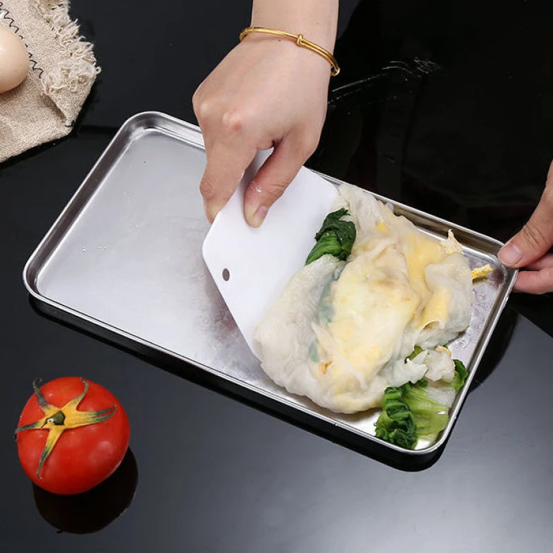 This stainless steel serving tray is perfect for presenting and organizing a variety of dishes.