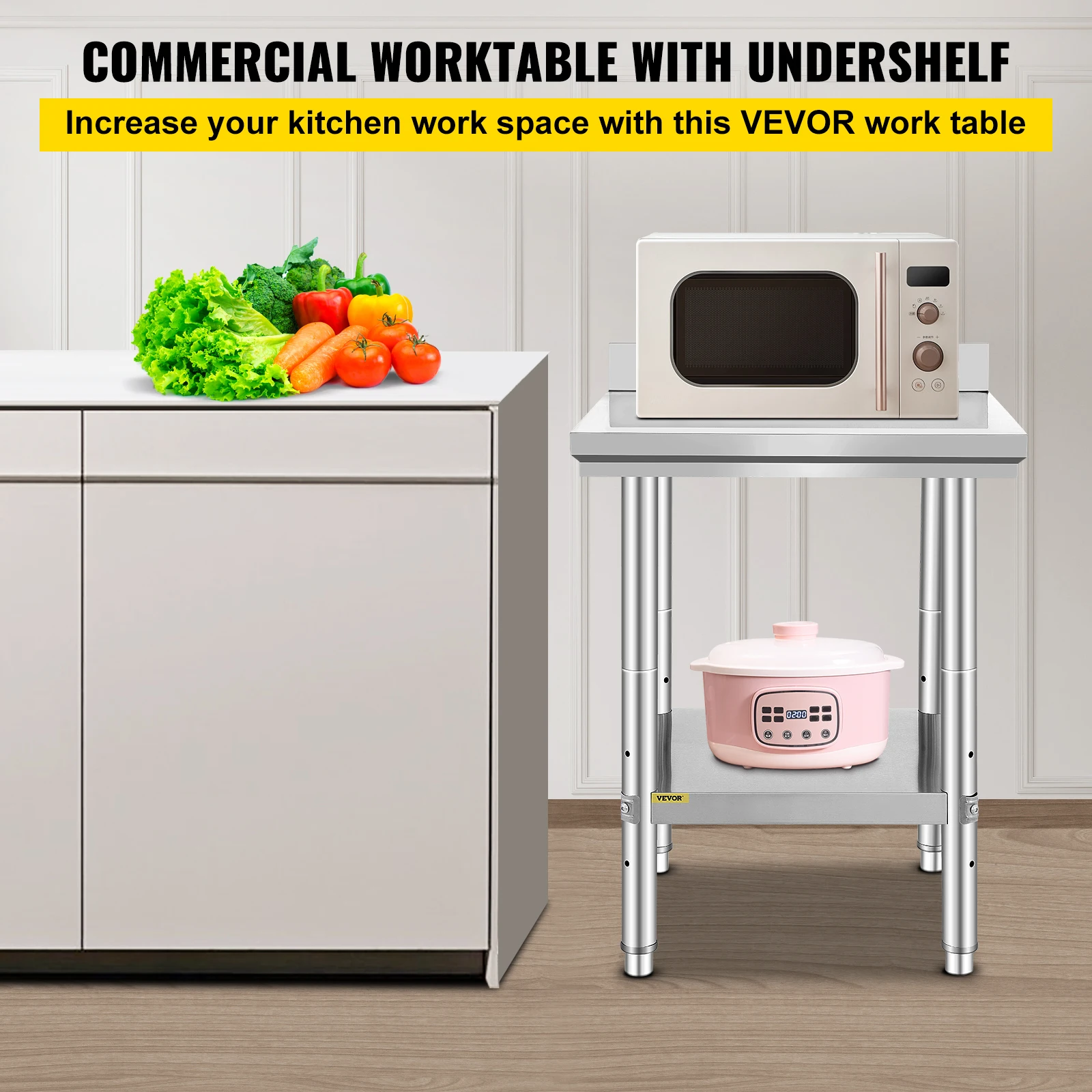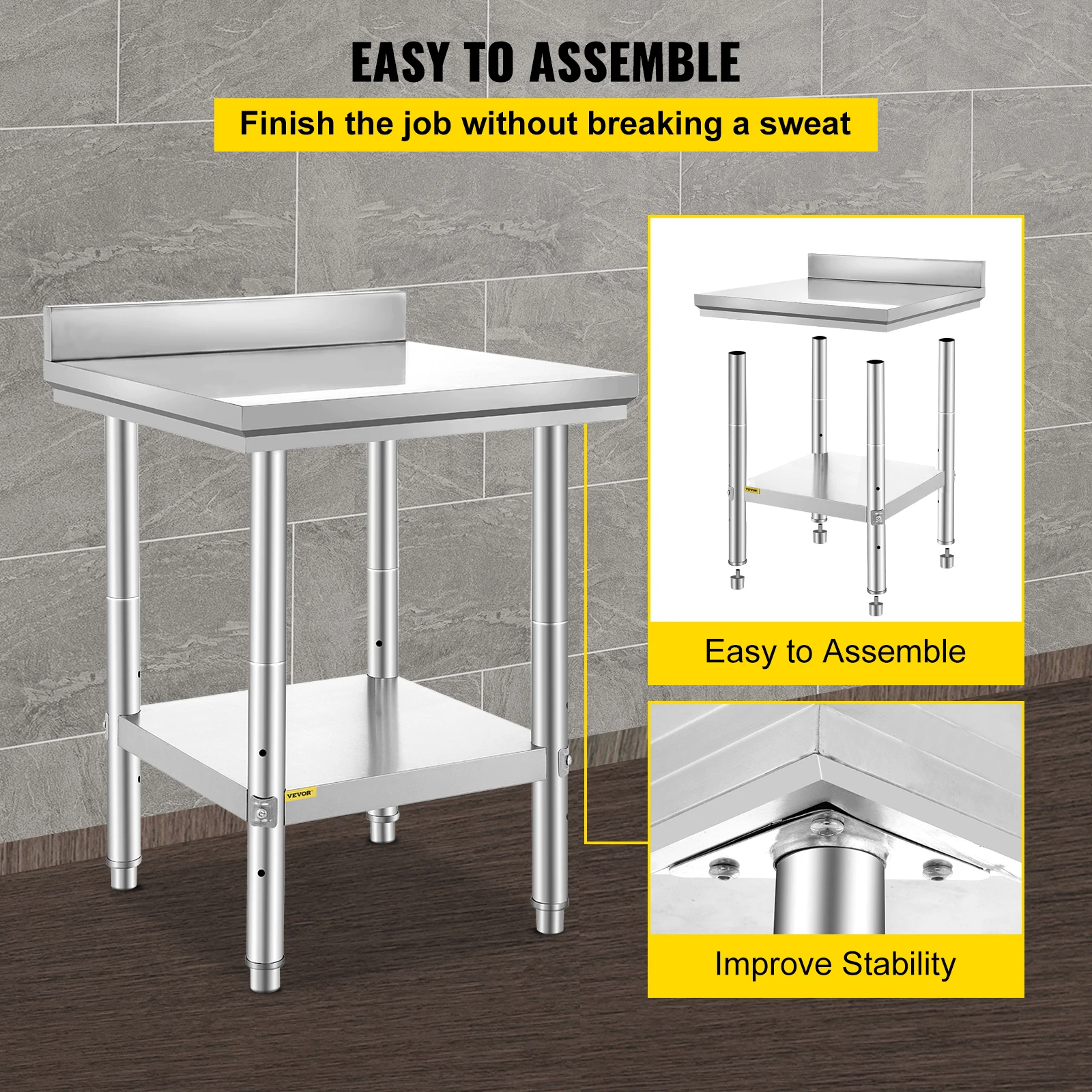This stainless steel work table is designed for professional kitchen use.